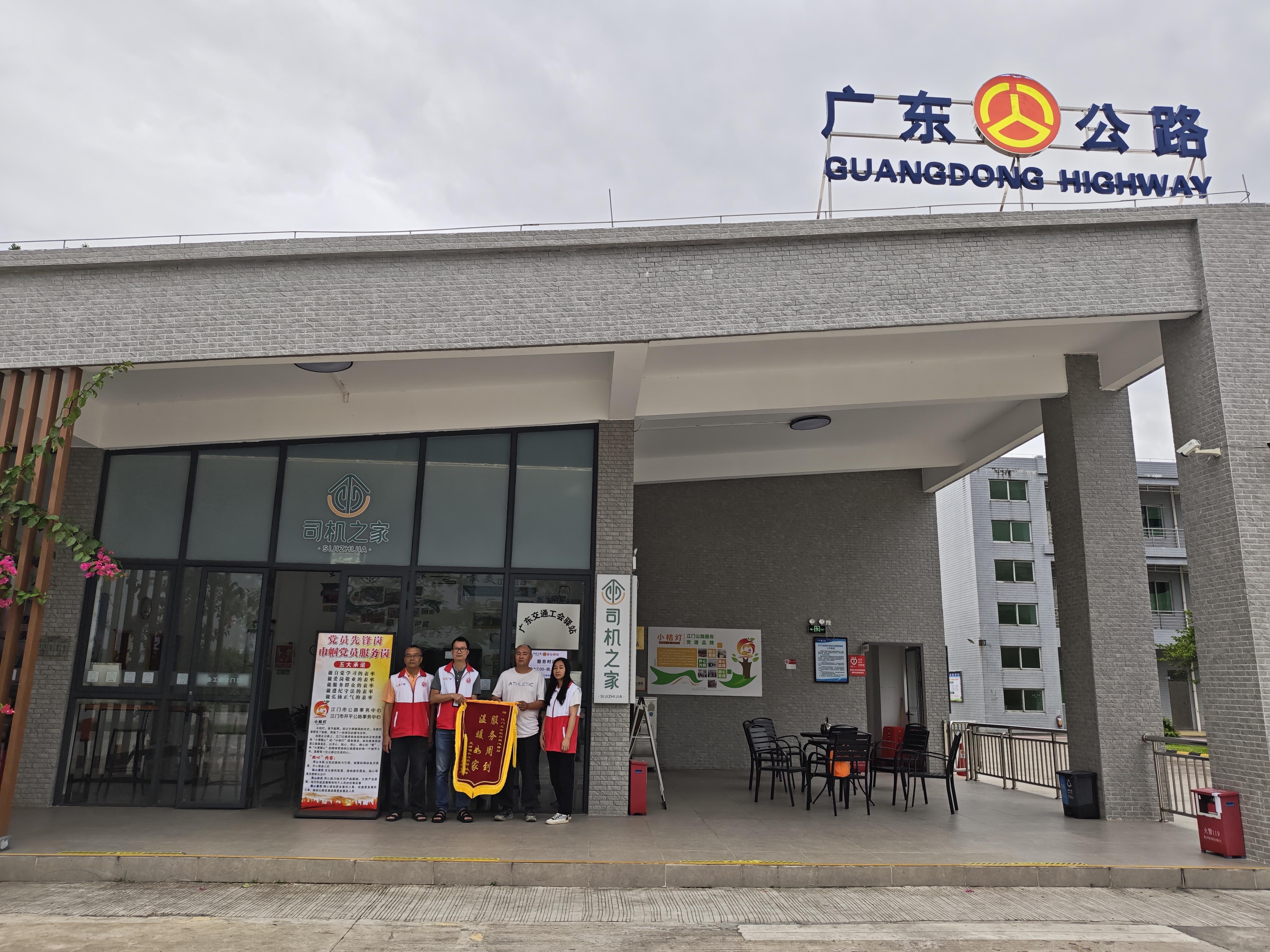 (热心群众为蚬冈服务区司机之家授旗)
