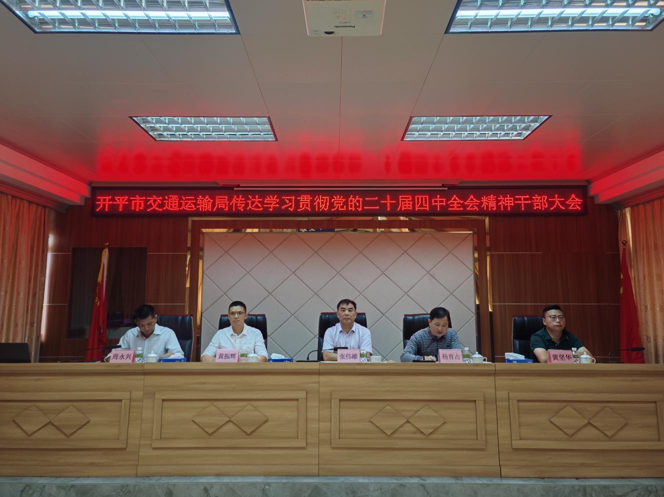 10月30日上午,开平市交通运输局召开传达学习贯彻党的二十届四中全会精神干部大会,深入学习领会习近平总书记在党的二十届四中全会上的重要讲话精神和全会精神,全面贯彻落实省、江门市、开平市委常委会及干部大会精神,研究部署全局贯彻落实举措,动员全体干部职工迅速把思想和行动统一到全会精神上来,推动交通运输事业高质量发展。局领导、机关各股室、大队及直属事业单位负责人参加会议。