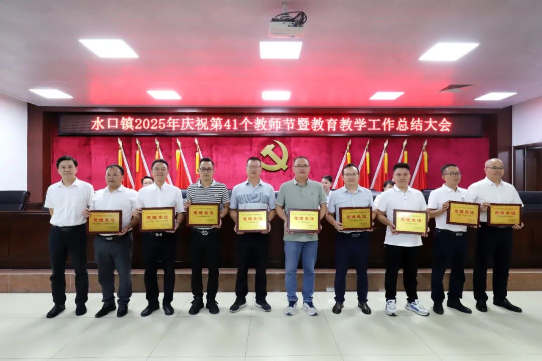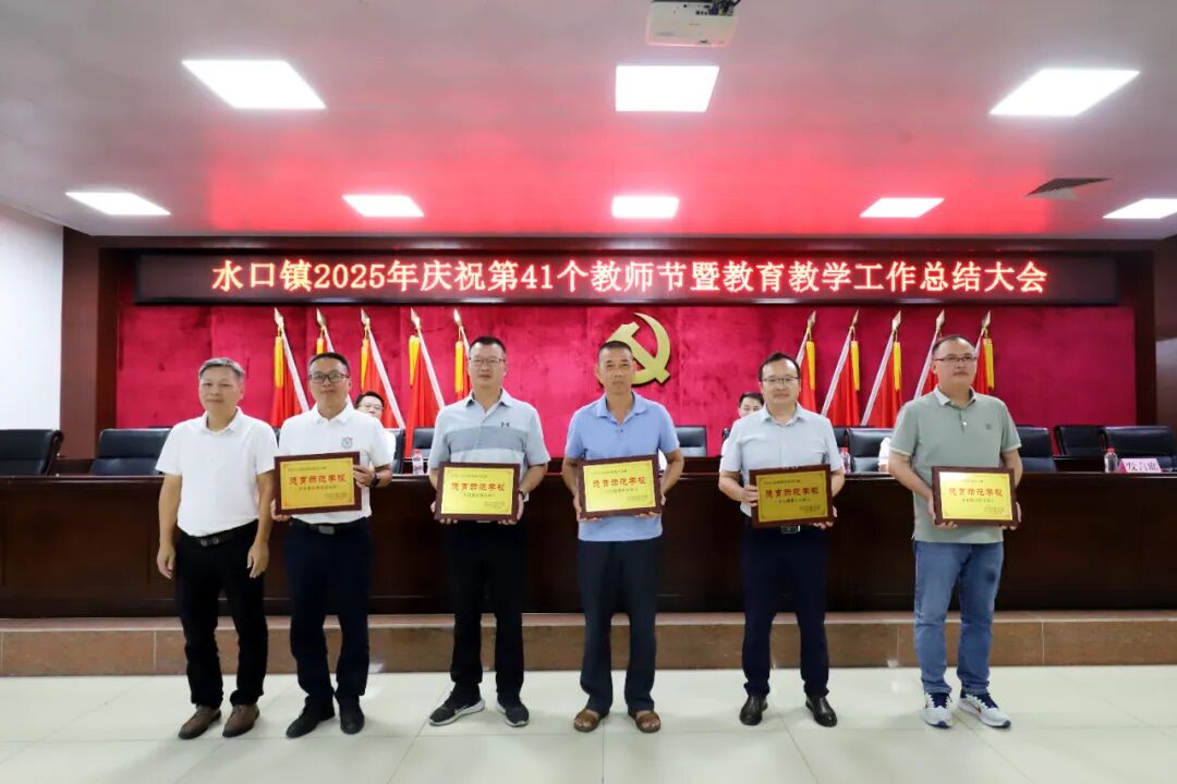 水口镇人大副主席冯惠清宣读了表彰先进决定,与会领导为荣获2024—2025学年水口镇教育教学工作先进单位(9所)、德育示范学校(5所)、德育先进个人(10人)、优秀班主任(19人)、优秀教师(33人)等先进集体和先进个人颁奖,并向全镇教师、教育工作者及离退休教师致以节日的诚挚问候和崇高敬意。