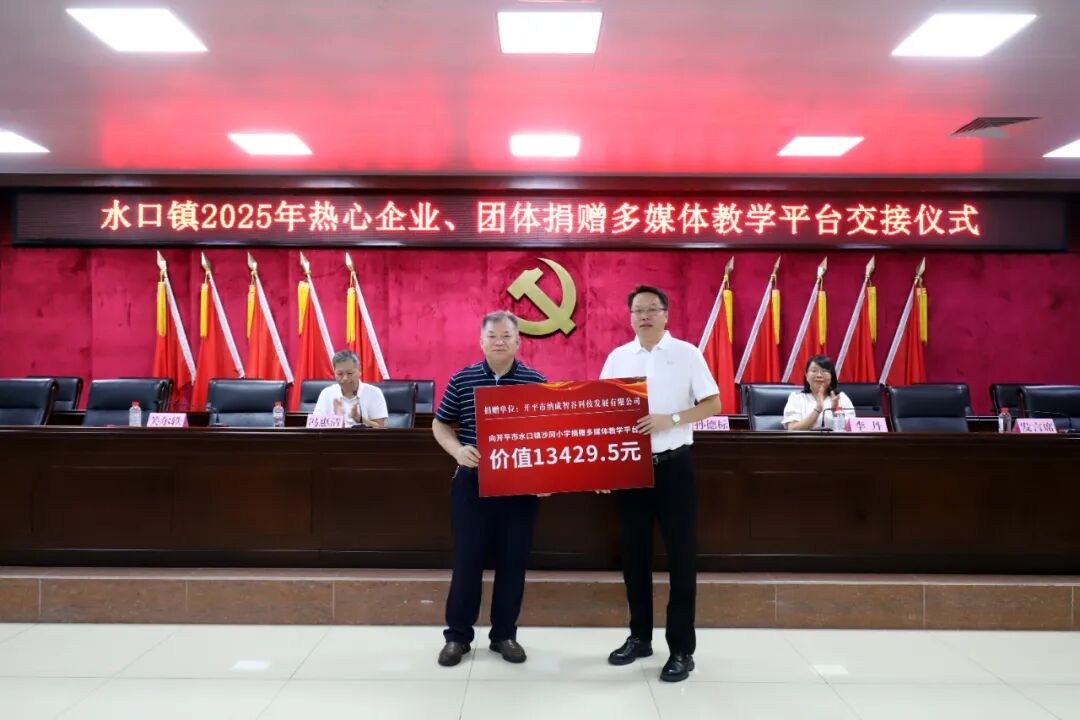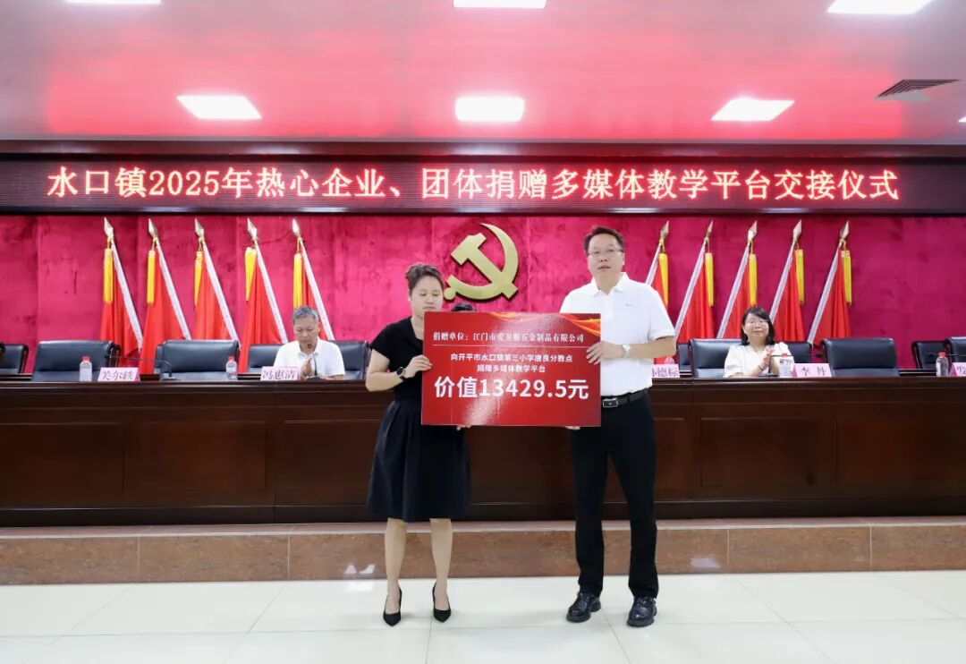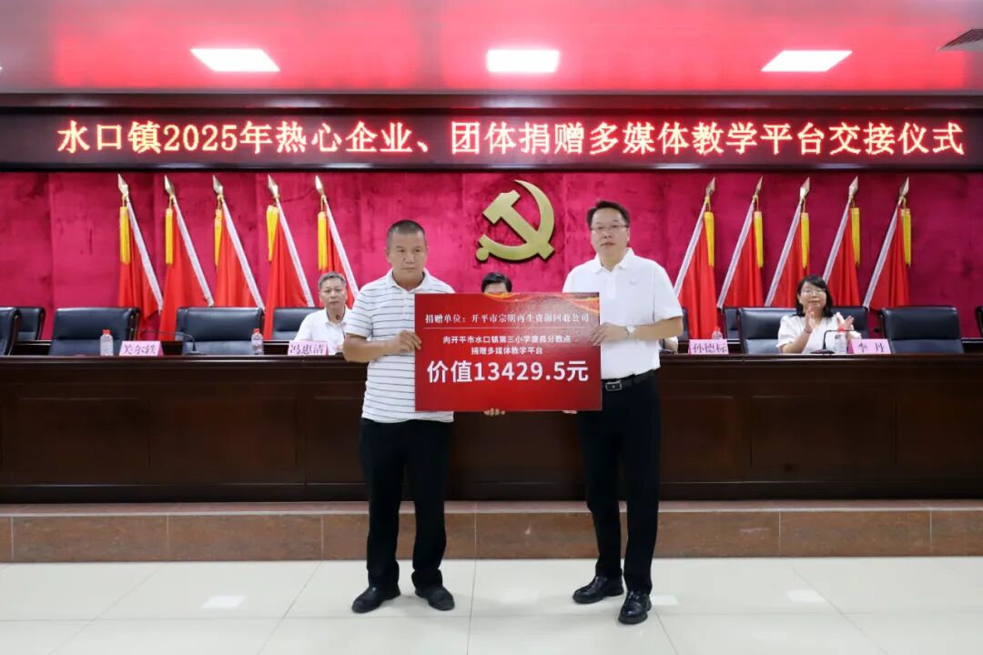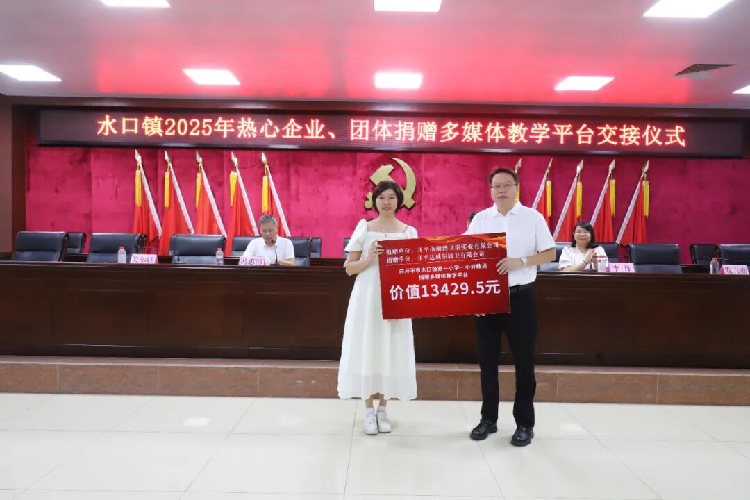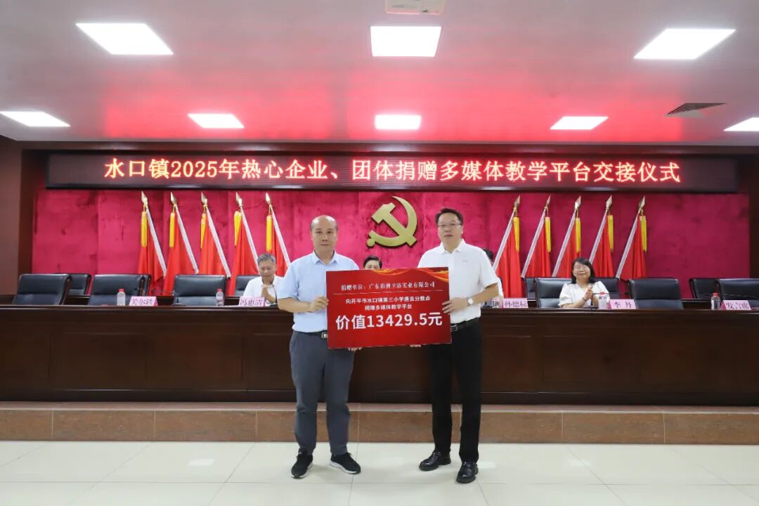 教育的高质量发展离不开全社会的共同参与和鼎力支持。大会现场特别举办了捐赠仪式,热心企业、团体积极践行社会责任,为水口镇教育事业贡献力量。据统计,本次捐赠总额约68万元,包含38个教学平台一体机教学设备设施和奖教助学金。其中,开平市水口镇泮村邝氏族务理事会单独捐赠了13个电化教学平台,其他热心企业合力捐赠了25个电化教学平台。这些教学设备将直接用于水口镇教育信息化建设,助力提升学校现代化教学水平、优化课堂互动体验。奖教助学金将用于激励一线教师深耕教学、潜心育人,从 “硬件升级” 与 “精神激励” 双维度为水口镇教育质量提升注入强劲动力。