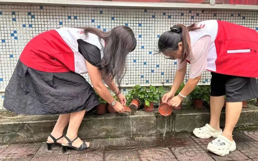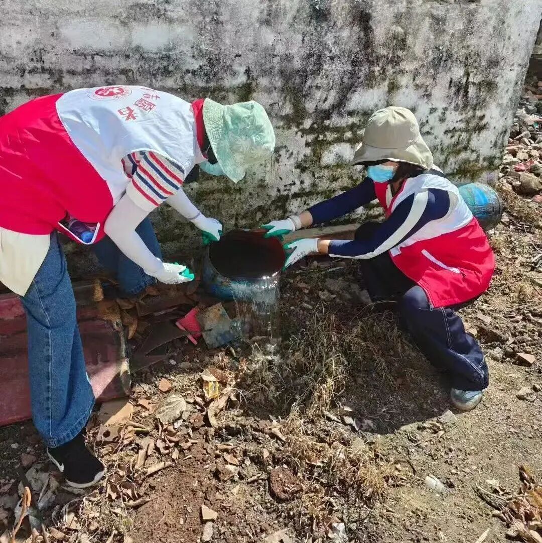 在后溪村委会、永安村委会和泮南村委会,二中教职工志愿服务队迅速融入村庄防控工作中,分别进行信息登记、入户宣传、整理台账、清理杂物等工作,把温情与净土留给了村民。沙冈中学志愿者团队清理东乐新村卫生死角,清运堆积杂物;沙冈小学自强分教点教师顶着闷热天气,持续清理积水容器并喷洒药剂,汗水浸透衣衫仍不停歇;泮村小学、水口镇第一小学志愿者分工协作,重点排查村民房前屋后的废弃瓶罐,宣传科普同步推进。致和小学“宣讲小分队”向村民派发宣传单,详解“发热、头痛”等症状及就医要点;红花小学教师走访独居老人、留守儿童家庭,手把手教老人使用驱蚊用品;龙塘小学志愿者还向村民示范“倒置容器防积水”技巧,将“无蚊则无病”理念融入实操。让“清积水、防叮咬、早就诊”理念深入人心。
